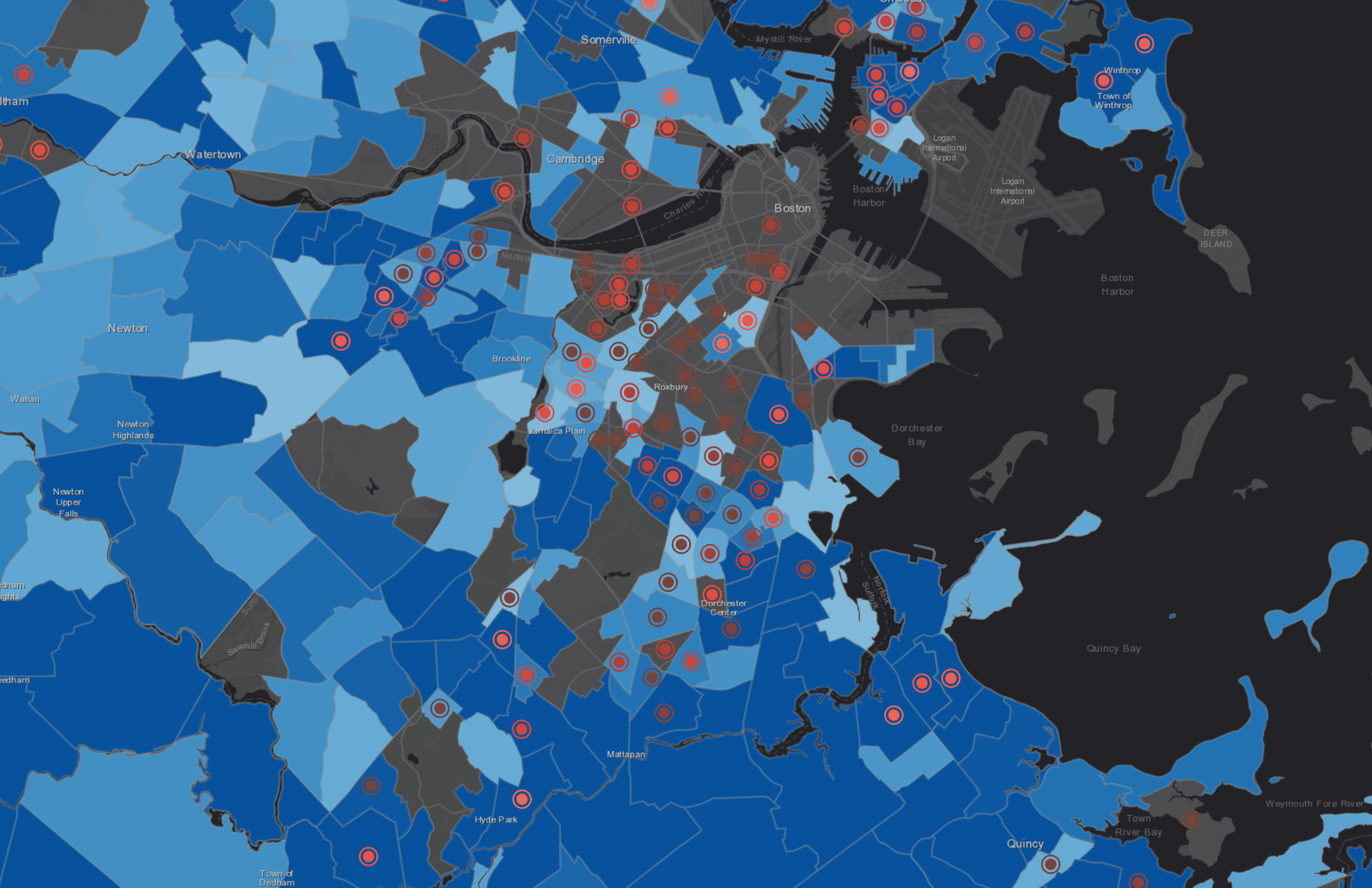 A modern map by Boston Latin School student Gideon Neave considers commute time (blue) and household income (red), and shows that people with less income are often subject to longer commute times.