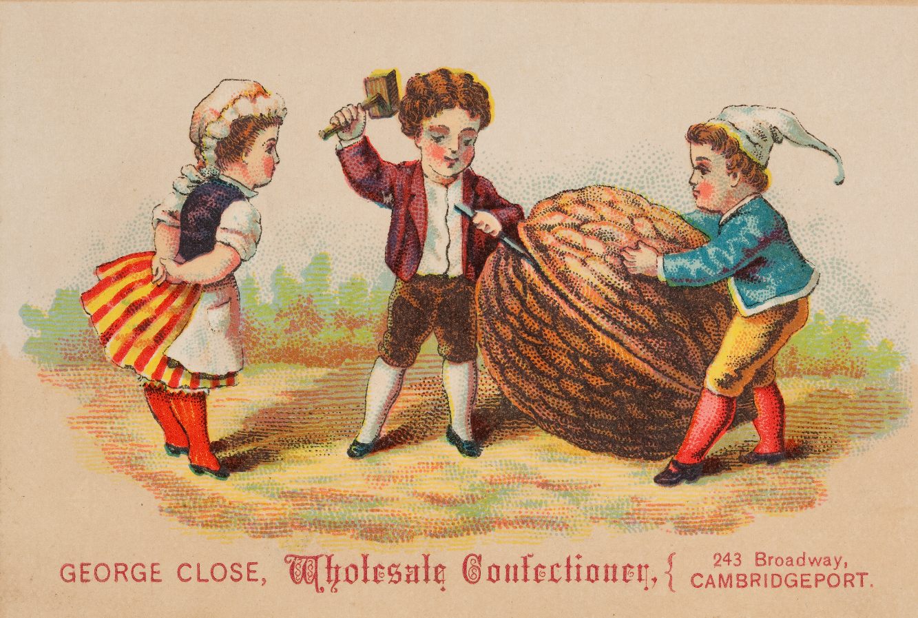 These cherubic children work together to get at this walnut on a trade card for Close. This design was not unique: at least one other late 19th century confectioner used the same image on his advertising cards.