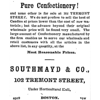 On the ground floor of the Horticultural Hall in downtown Boston, Southmayd's positioned itself as the safe option for candy lovers in this "age of impurities and shams." It sold a variety of confections from this convenient location. These included gum drops, ice cream candies, and lemon lobster sticks, as well as a refreshing beverage called "Ottawa Beer."