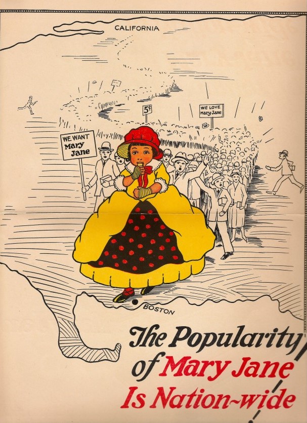 This mappy ad for Mary Jane shows a parade of people stretching across the nation from Boston to California, clamoring for the molasses-based sweet.