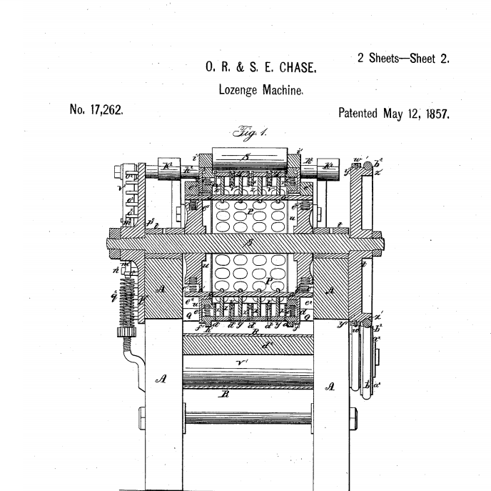 This diagram is from the May 12, 1857 patent by the Chase brothers for their Improvements in Machinery for Making Lozenges. This came a decade after their original machine.