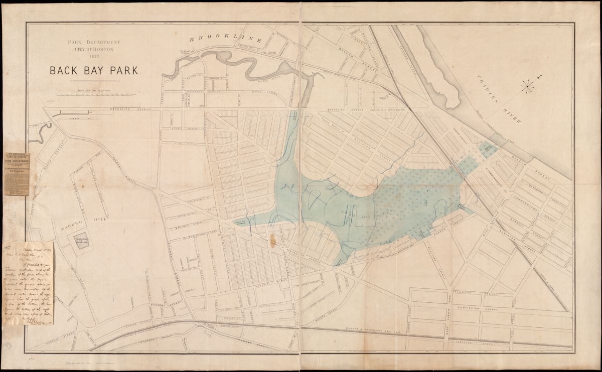 The 1877 map below shows an early plan for Back Bay Park, what we now call Back Bay Fens. The blue lines trace out the winding routes of the Muddy River’s former delta. The attached newspaper advertisement notes an 1878 competition “for the best Plan for laying out the Back Bay Park.” The winning entry was simply a plan for a formal flower garden, which the Parks Department discarded, calling instead on the skills of the visionary landscape architect Frederick Law Olmsted. Olmsted’s eventual design for the park system called for a naturalistic style that echoed Romantic era ideals of bringing the countryside into the city.