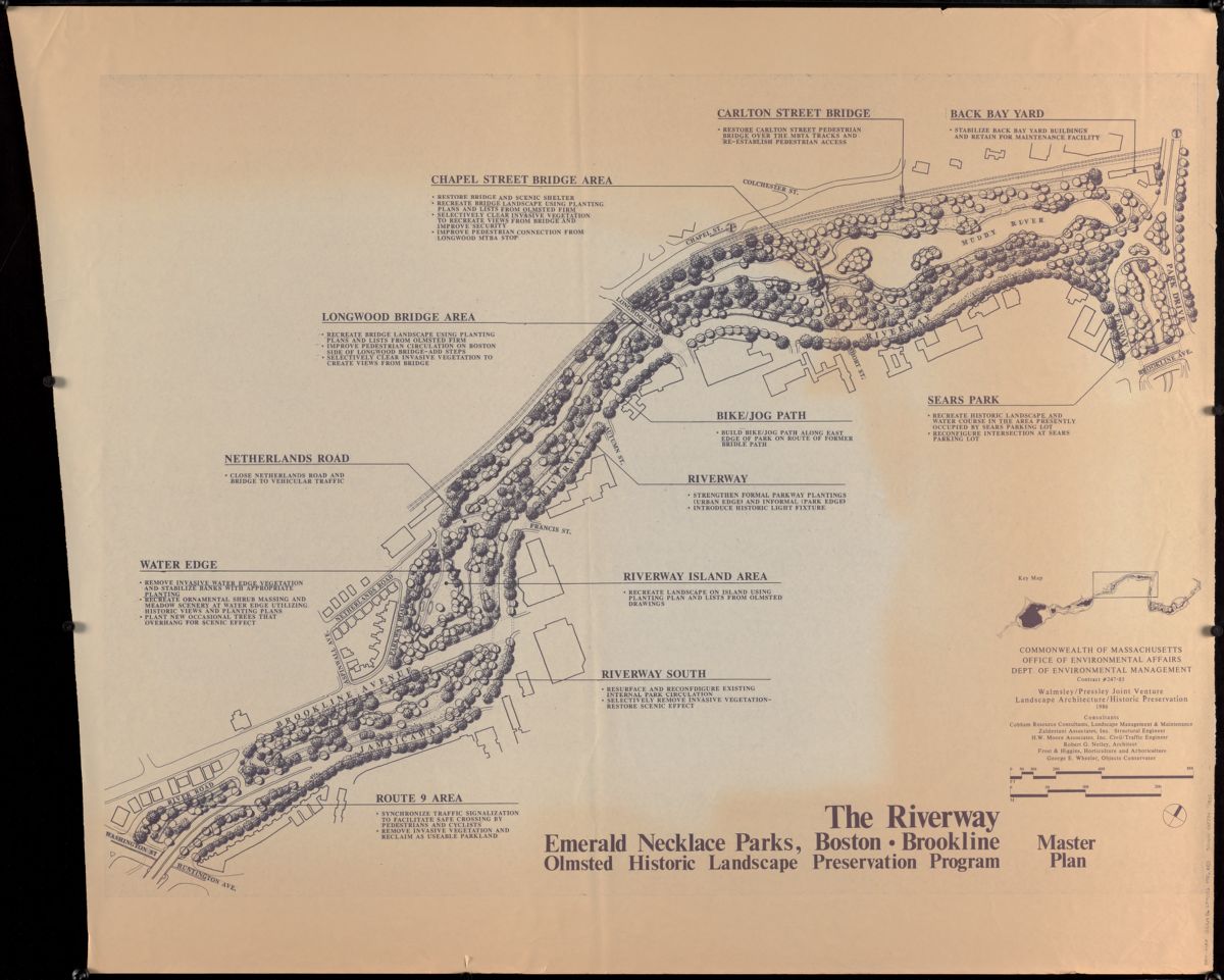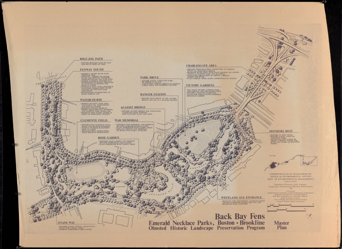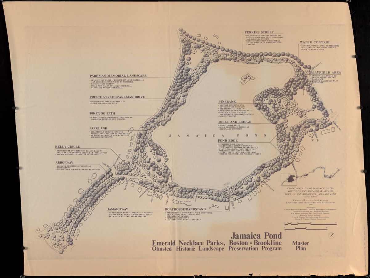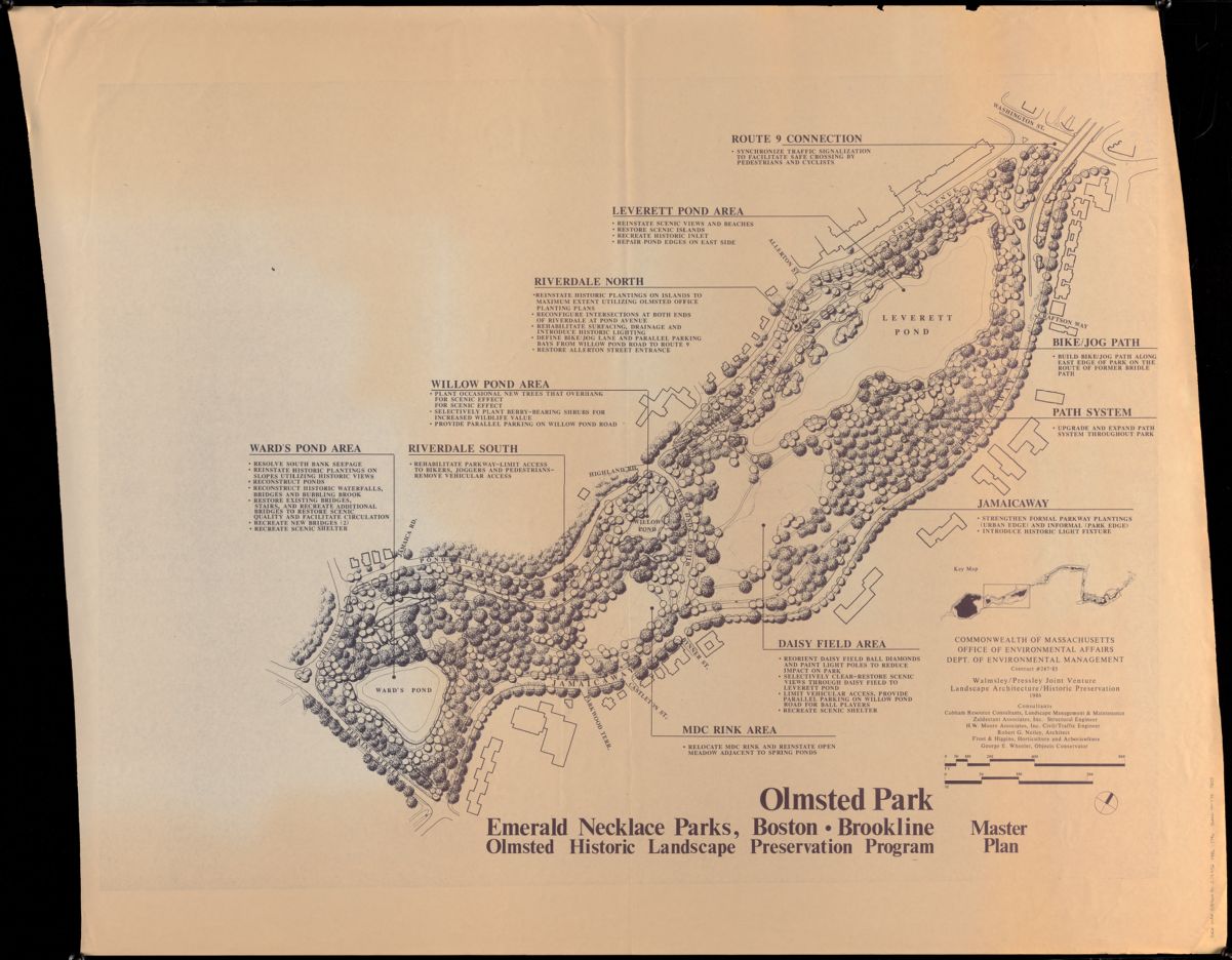 The next series of 4 maps—documenting Back Bay Fens, Olmsted Park, Jamaica Pond, and Riverway—were published in 1986 by the Commonwealth of Massachusetts Department of Environmental Management as part of the Olmsted Historic Landscape Preservation Program. The program was born in the 1980s out of "a national awareness of how remarkable the Olmsted firm's contribution to American history and the urban environment had been." Created under the program, each map "document[s] the original design intent, use, appearance and integrity of the parks" as part of the 1989 Master Plan, which "provides a preservation framework to guide all future planning and action" of Olmsted parks.