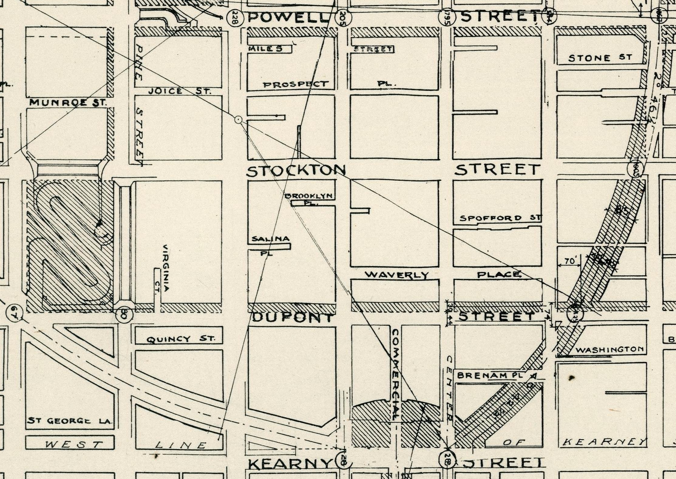 The 1906 addendum to the Burnham Plan for San Francisco shows the planned street widening for what is now considered core Chinatown, bounded by Powell Street to the west, Bush Street to the south, Kearny Street to the west, and Broadway to the north. These plans were never realized: largely due to a lack of funding and other immediate priorities in the aftermath of the earthquake, but more critically, because merchants in San Francisco's Chinatown acted quickly.