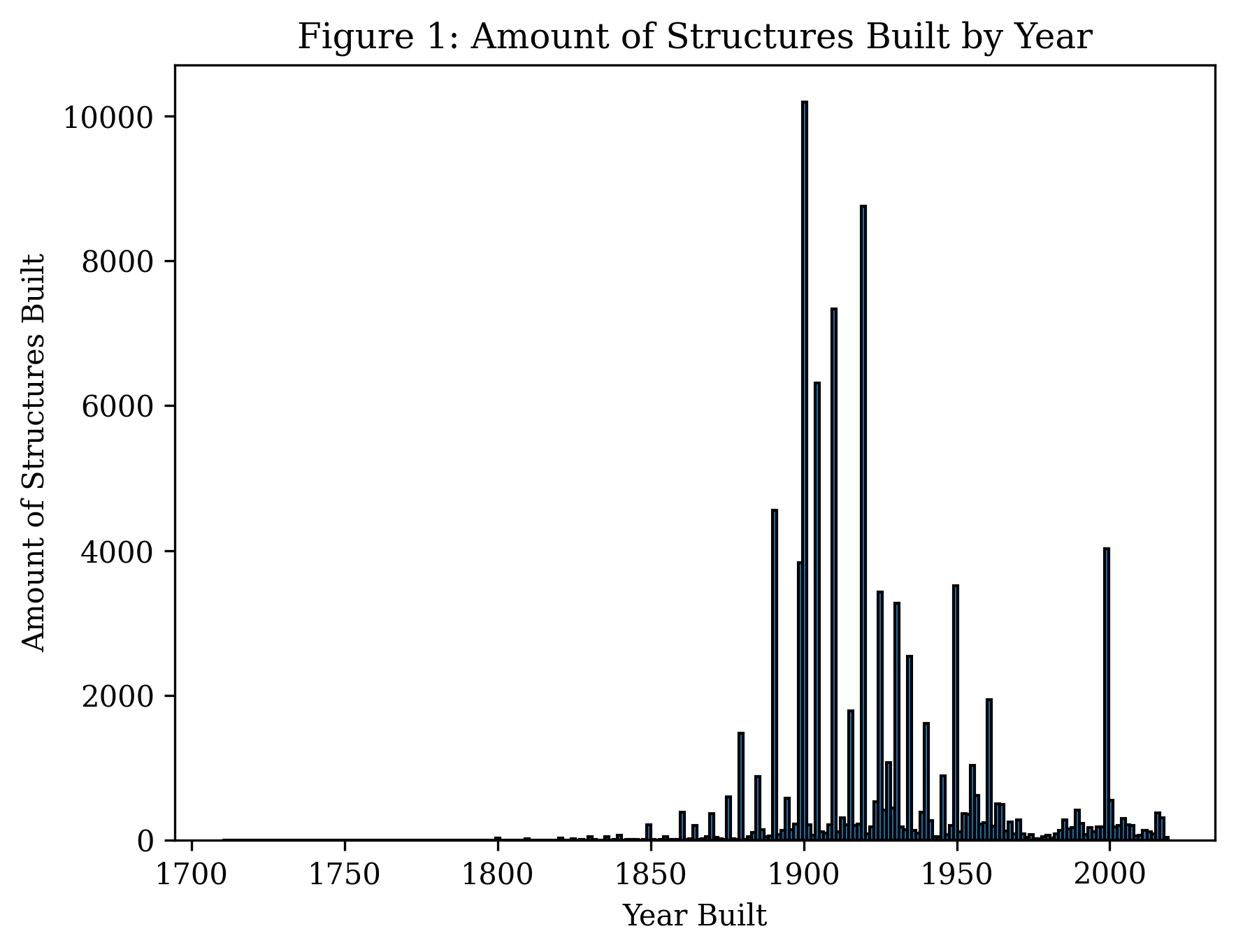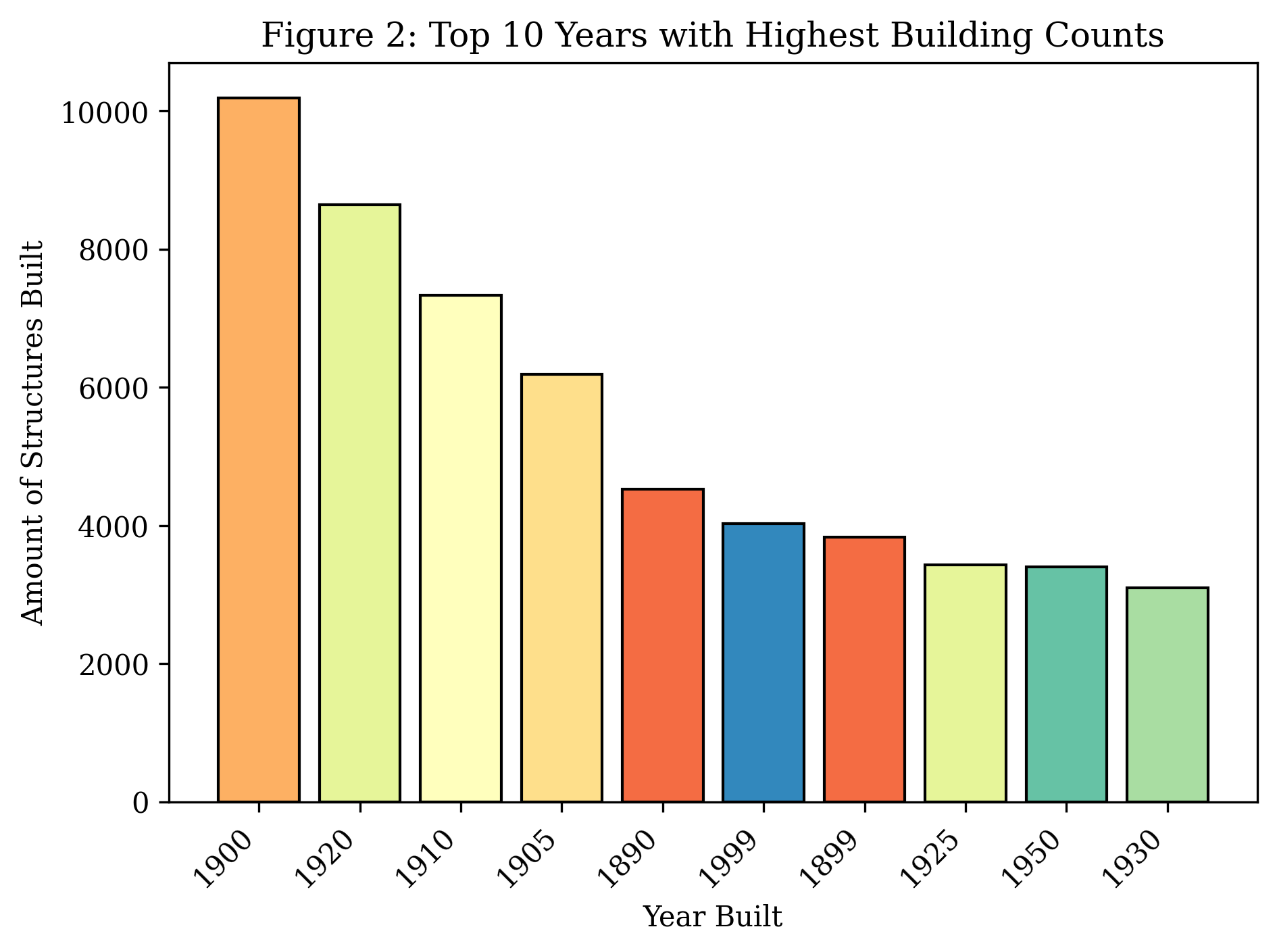 Sometimes, understanding patterns in spatial data requires looking at more than maps. The first histogram below (Figure 1) represents the distribution of construction over time. It’s not very evenly distributed and has large spikes in round-numbered years, like each decade. The second histogram shows the top 10 most populated years in which buildings were constructed throughout the data set. Patterns here most likely represent a general idea of when a structure was built, rather than precise knowledge of an exact date.