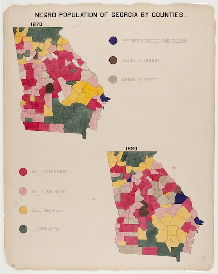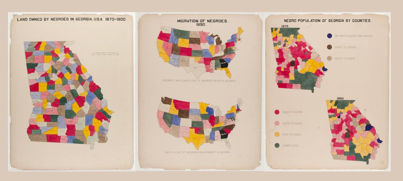 In 1900, NAACP member W.E.B Du Bois and a group of Atlanta University graduate students contributed over 30 statistical charts and visualizations for the Exhibit of American Negroes as part of the Exposition Universelle in Paris. Highlighting Black ownership of land, migration, and population distribution, these maps aimed to display “a wide spectrum of Black experience” and inform the international community about the gains Black communities had made in “since slavery and in face of continuing racism.”