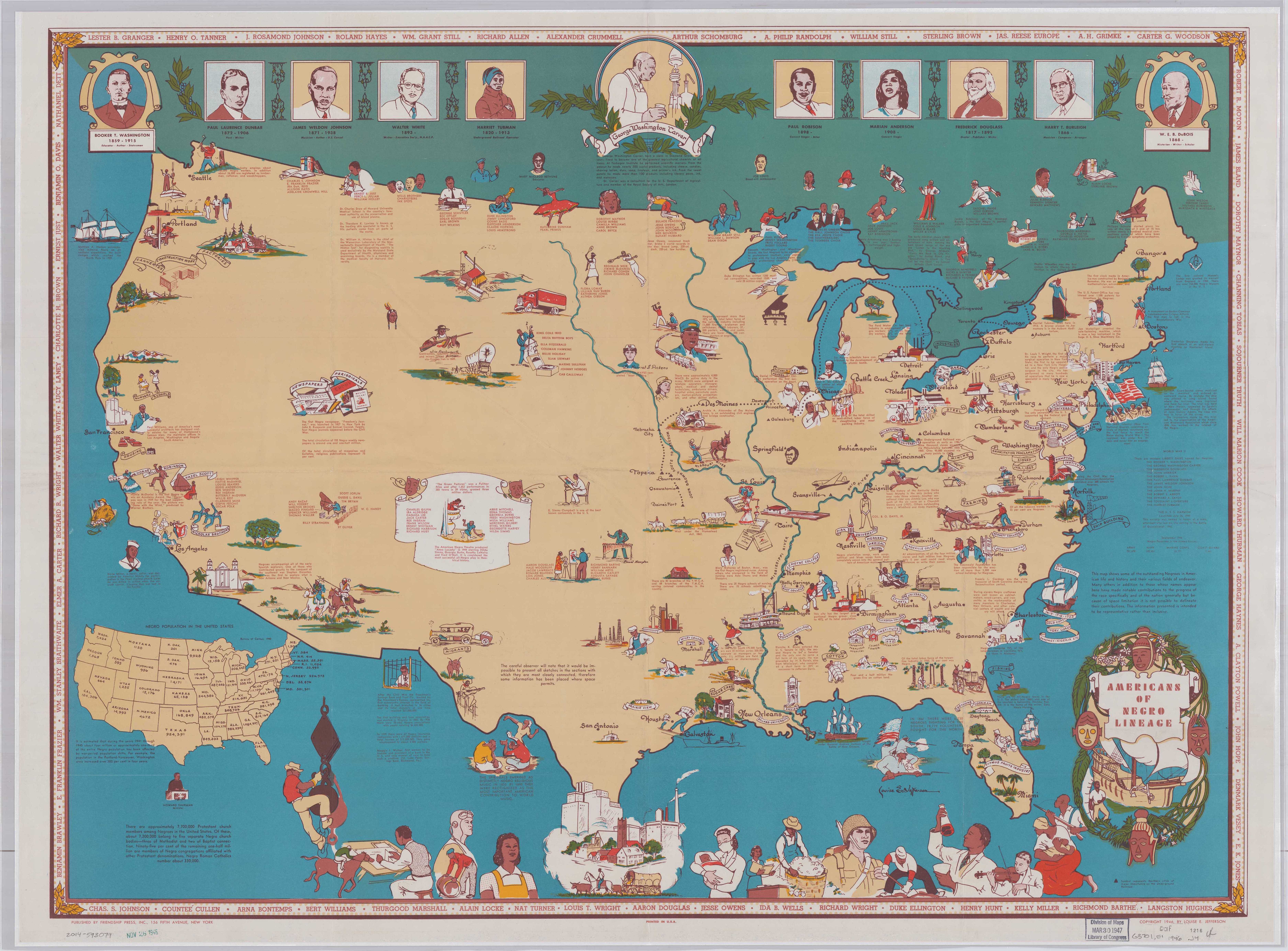 Later in the twentieth century, illustrator Louise E. Jefferson created a series of maps representing the histories and cultures of marginalized groups in the United States. This 1946 map, created to reflect on the Harlem Renaissance of the 1920s and 1930s, scatters pictorial representations of people and places important to Black culture across the United States and southern Canada. She recognizes Benjamin Banneker as the maker of the first clock in the United States, Hattie McDaniel for her Academy award win, and Dr. Charles Drew of Howard University Medical School for his work on blood plasma use and preservation, to name just a few.