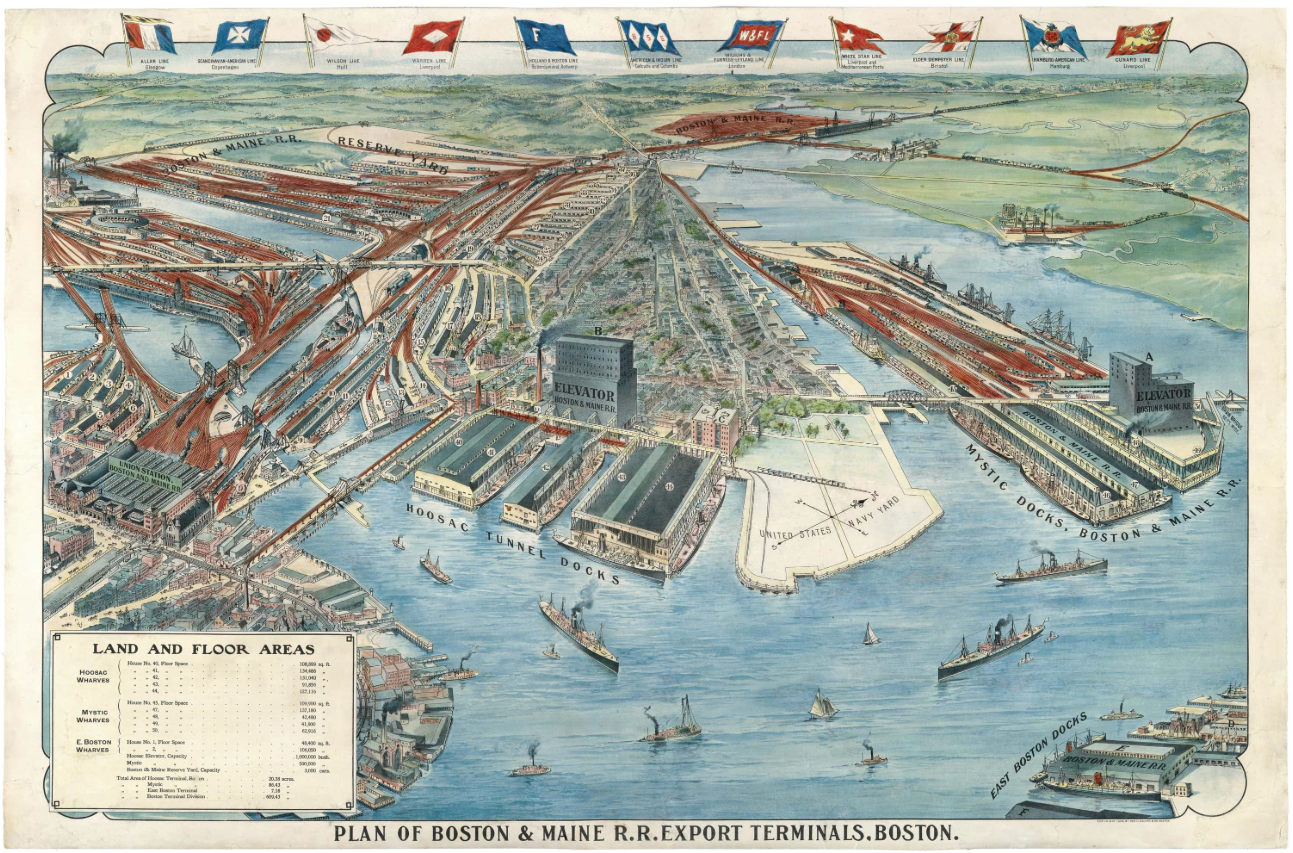 This unique bird’s eye view of the Boston harbor looks north, with the North End at left, Charlestown at center and right, East Boston in the lower right, and Cambridge, Somerville, and Chelsea in the background. The image is primarily focused on the rail lines of the Boston & Maine Railroad, clearly seen in a red-orange color. Converging on Union Station (now North Station) and its port facilities, the true size of the Boston & Maine Railroad was greatly emphasized through some artistic interpretation, like the omission of the Bunker Hill Monument.