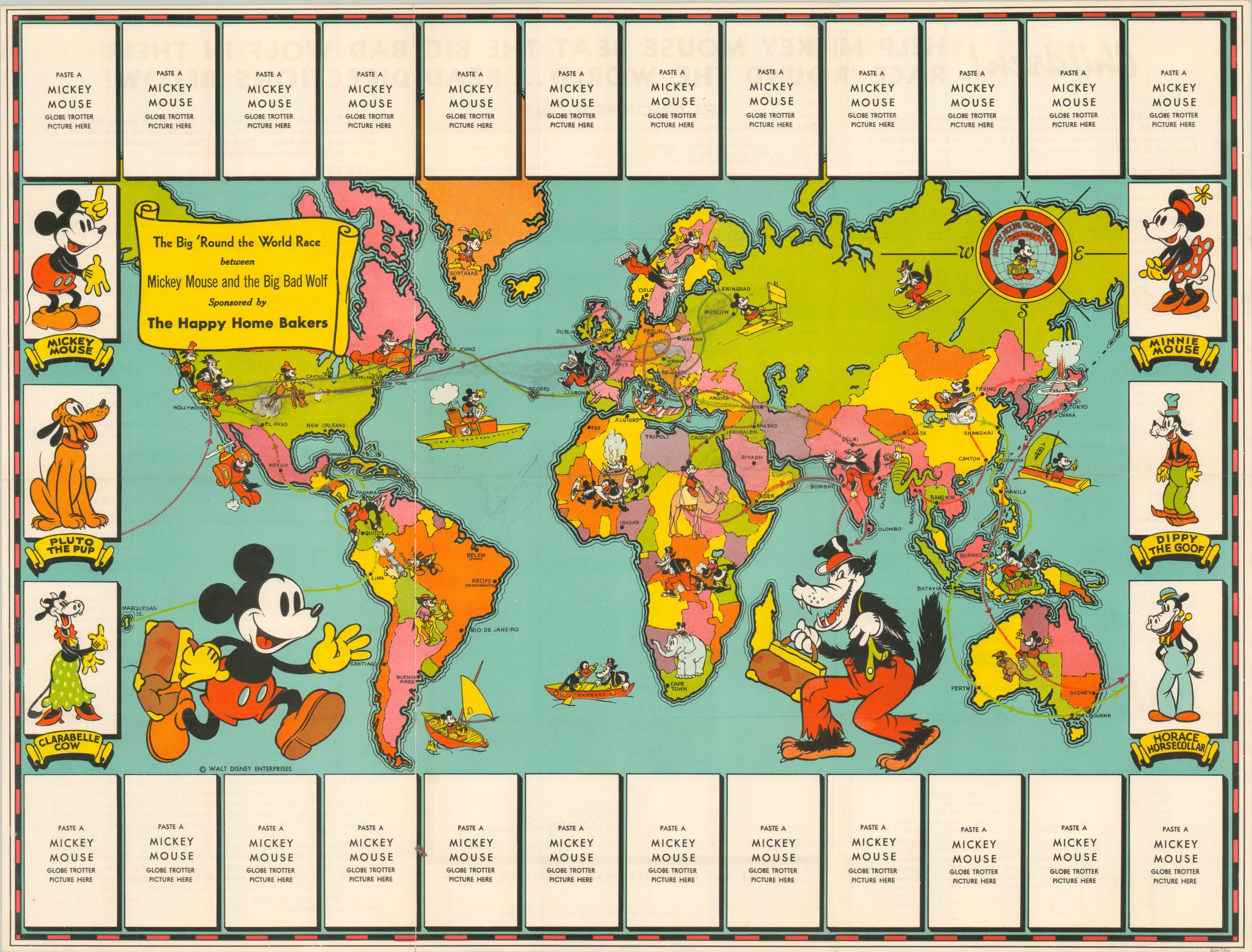 This map is an early example of a shift in marketing strategy when companies began advertising directly to children. This campaign was designed to promote the sale of a new and innovative product – sliced bread! This map depicts two recognizable characters from the up-and-coming Walt Disney Co., Mickey Mouse and the Big Bad Wolf, racing around the globe, and the only way to find out their locations was by buying loaves of bread. Bread with a special “Mickey Mouse Band” would contain a small trading card and allowed the purchaser (or their child) to follow the progress of the race “across the world.” Blank spaces at the top and bottom of the map allowed for the display of the entire collection of bread tabs.