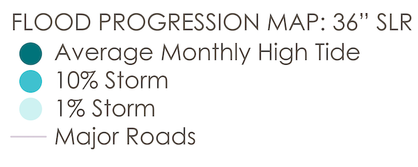 This 2015 map from the City of Boston's Climate Ready Boston initiative depicts a sea level rise scenario of 36 inches, which is likely by 2070. All four sites of energy production discussed in this article fall within the 36-inch inundation zone.