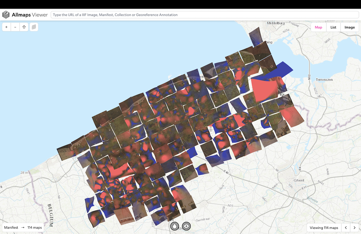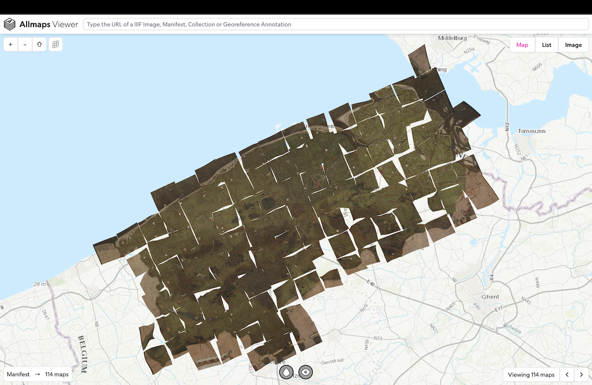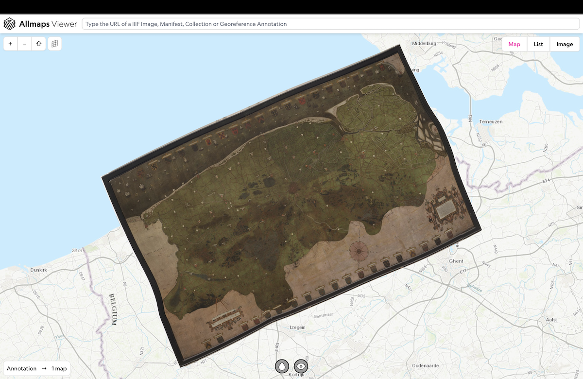 The project emerged out of a collaborative effort to digitize the manuscript map of the Liberty of Bruges by Pieter II Claeissens. This map, covering a vast area of coastal Flanders and its hinterland, stands out for both its visual richness and its cartographic precision. Following its digitization, the Flemish Heritage Agency sought to integrate it into the national geoportals geoportaal.be and geopunt.be, making it publicly accessible and integrated into modern mapping tools.