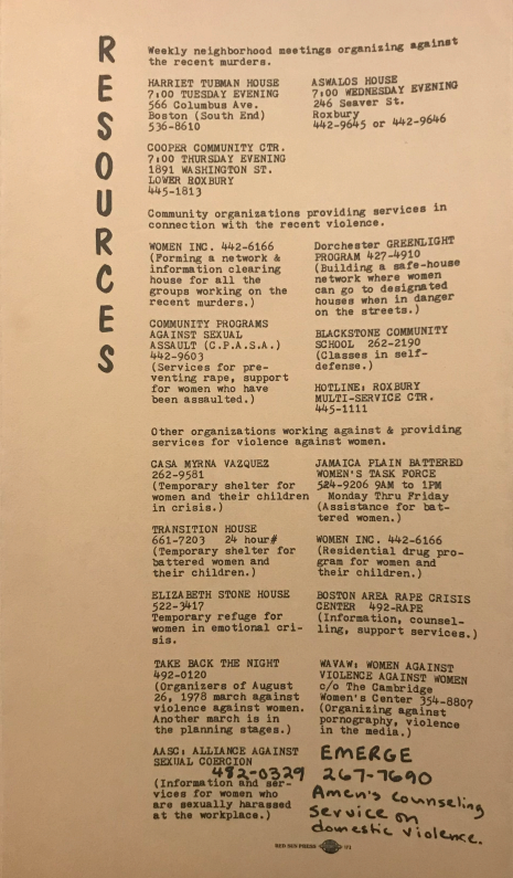 A list of resources included in the Combahee River Collective's 1979 pamphlets which show the extent of the community response to the murders. Including weekly meetings, support networks, self-defense classes, as well as a list of local organizations working against violence against women. From the digital collections of The History Project: Documenting LGBTQ Boston.