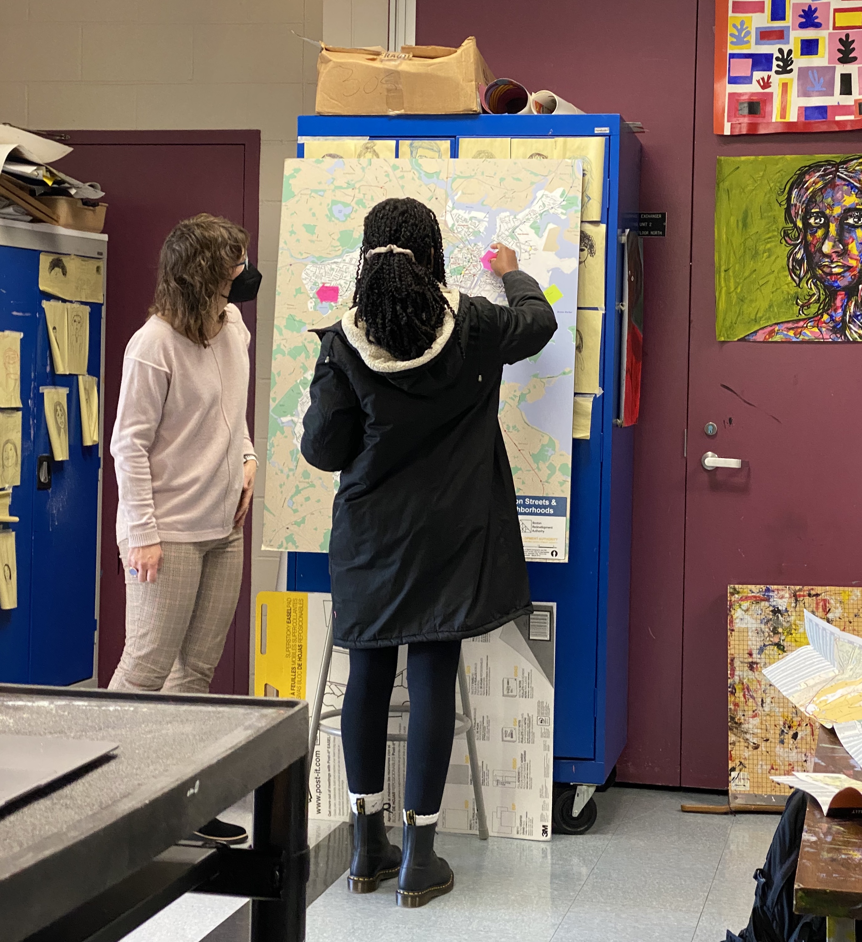 Students began by mapping their city, from labeling the different neighborhoods of Boston on a blank map to creating a collaborative Google My Map showing a variety of places they go (or don’t go) in their daily lives. Students explored ideas of boundaries in Boston and created maps where they divided up the city in new ways based on their own experiences or other criteria. They also learned about the petition and successful removal of “The Emancipation Group” statue and discussed how we memorialize people and events in Boston and around the country, including the naming of their own school after educational leader Margarita Muñiz.