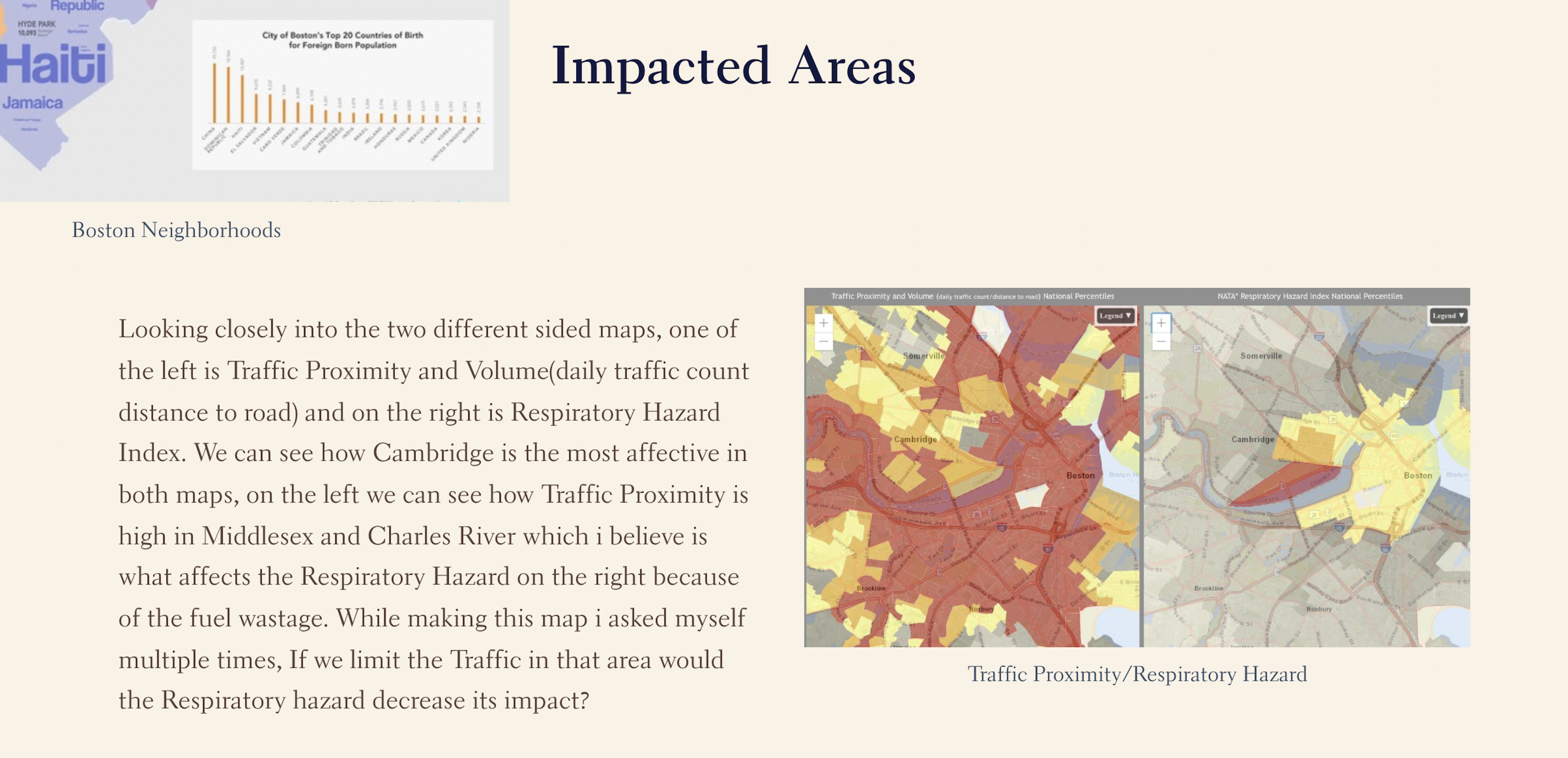 Snapshot of a student's final Storymap exploring the relationship between Traffic Proximity and Respiratory Hazard.