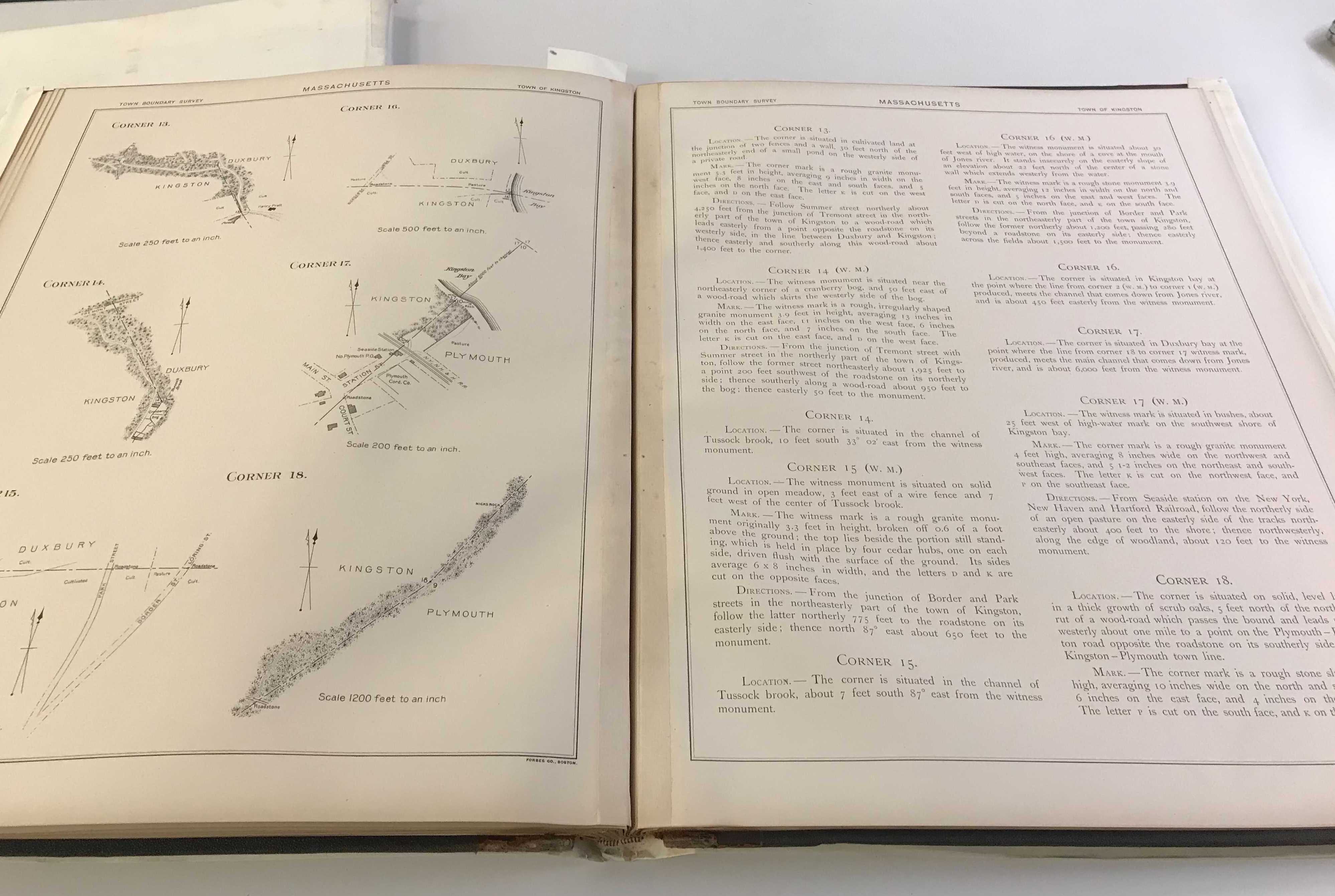 In the early twentieth century, the State of Massachusetts ordered the Topographical Survey Commission to standardize the geographic survey points which marked out the borders between municipalities. Unlike in the Midwest, where counties and townships are based on a rectangular grid survey, the lines between New England towns are defined by a connect-the-dots pattern that often references landmarks, like an old pine tree or a stone wall. The State Library has digitized many of these atlases for viewing online. (We also have some in our collections, but they haven't been digitized yet.)