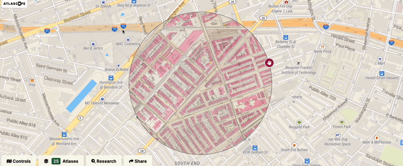 In January 2023, when we released an updated version of Atlascope---the Leventhal Center's digital tool for exploring historic urban atlases---we rolled out new features for creating Atlascope Tours and user-submitted annotations, as well as searching photos on Digital Commonwealth by geographic area. These new features extend Atlascope into a tool that enables users to research, curate, and interpret their own stories.