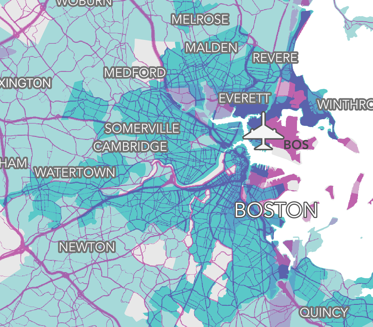 Panning over to Westfield, Chicopee, and Springfield, we find a number of noisy areas caused by airports, including the Westfield-Barnes Regional Airport, the Westover Airport, and the Baystate Medical Center Heliport. Much of this area is pink, covering thinly populated areas, though sections of the densely populated core area of these three cities appears violet and purple. By contrast, the much larger Logan Airport—with a noise area that includes a lot of unpopulated ocean area— fades into the densely-populated hustle and bustle of Greater Boston. What we take away from this depends on our perspective: we could make an argument that the airfields of western Mass are less invasive because they impact fewer people, just as easily as we could argue that Logan Airport is less invasive since it already exists within the loud urban core. As critical cartographers have long argued, maps don't just represent the world as it is---they help create it, too.