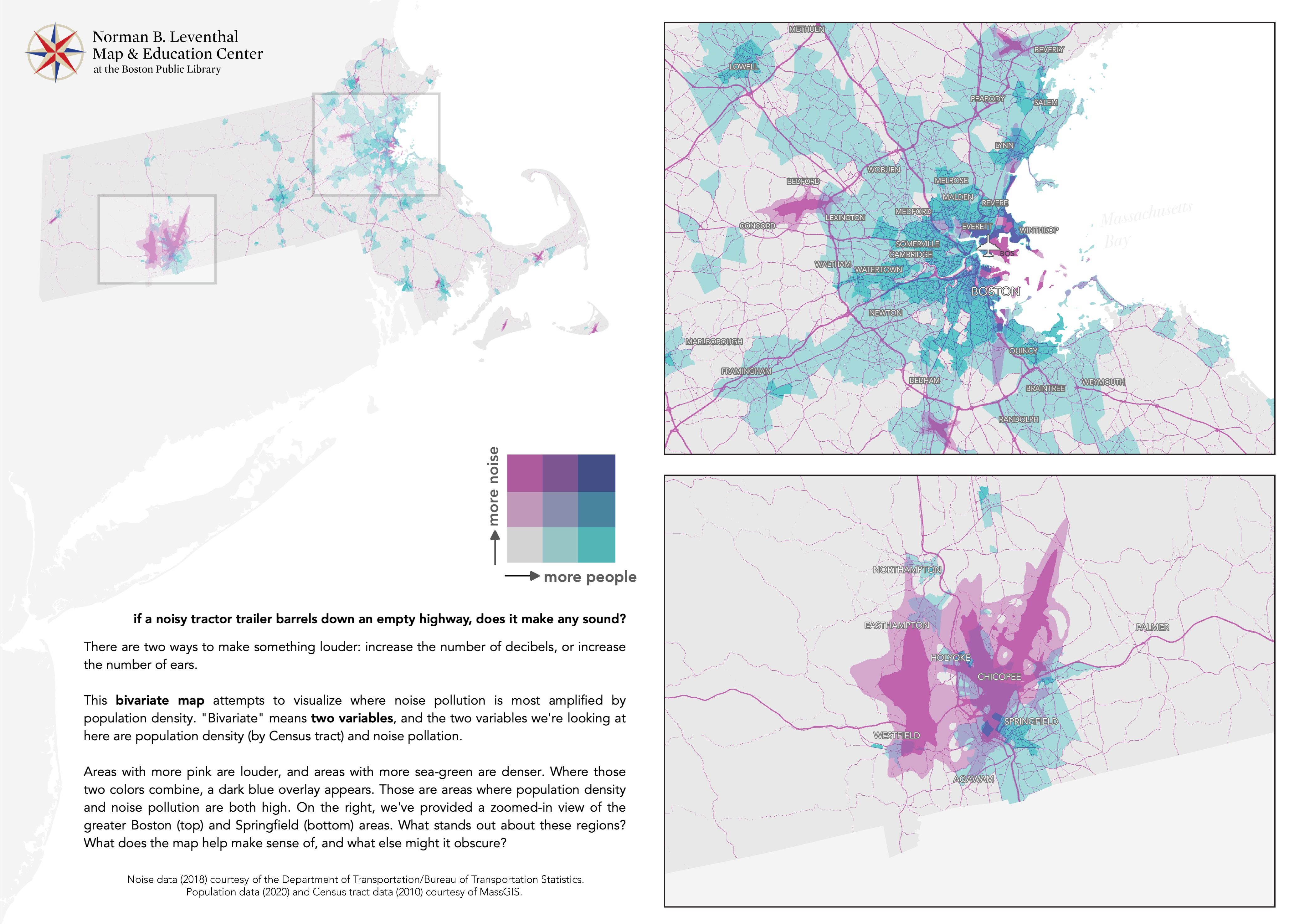 There are two ways to make something louder: increase the number of decibels, or increase the number of ears. Across the municipalities of Massachusetts, how many places exist where there's both a good deal of noise pollution and plenty of people to hear it? In order to determine where the noisiest noise intersects with the most people (and vice versa), our bivariate map overlays the noise data with population data at the Census tract level from 2020.
