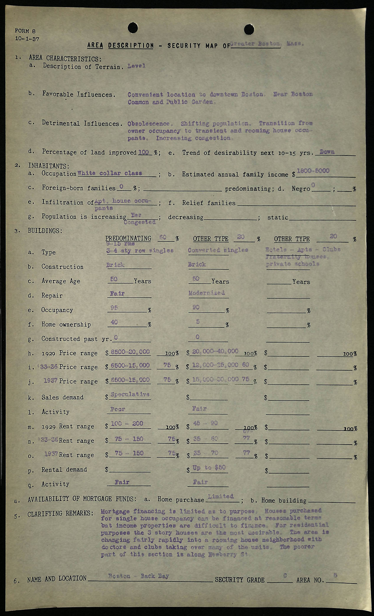 Area description sheet for Boston's Back Bay neighborhood, courtesy of Mapping Inequality