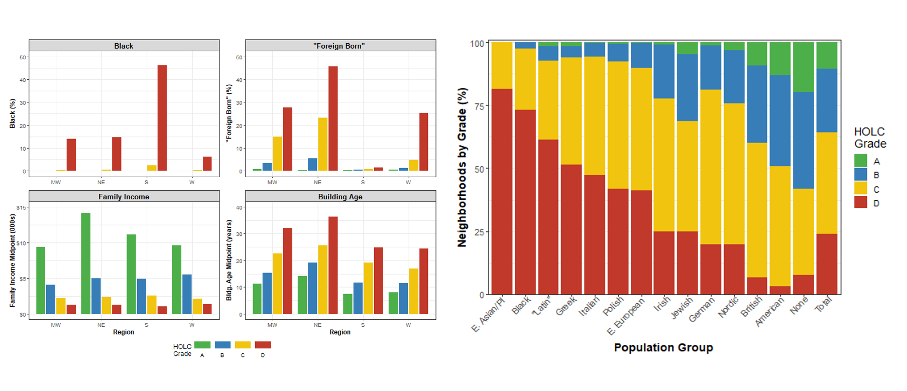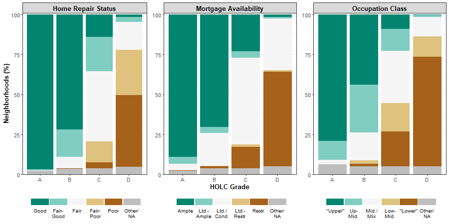 SM: You could, for example, run a regression to get an idea of which variables---race, nationality, building age, family income, occupational class, repair status, and so on--- contributed to the neighborhood grade assignment in different regions. That's one way you could think about it. Perhaps more interestingly, for me, the dataset provides an opportunity to break down the neighborhood grades altogether. With HOLC maps and redlining, so much attention is just given to the A through D grades, but there's a lot of intra-grade variability.