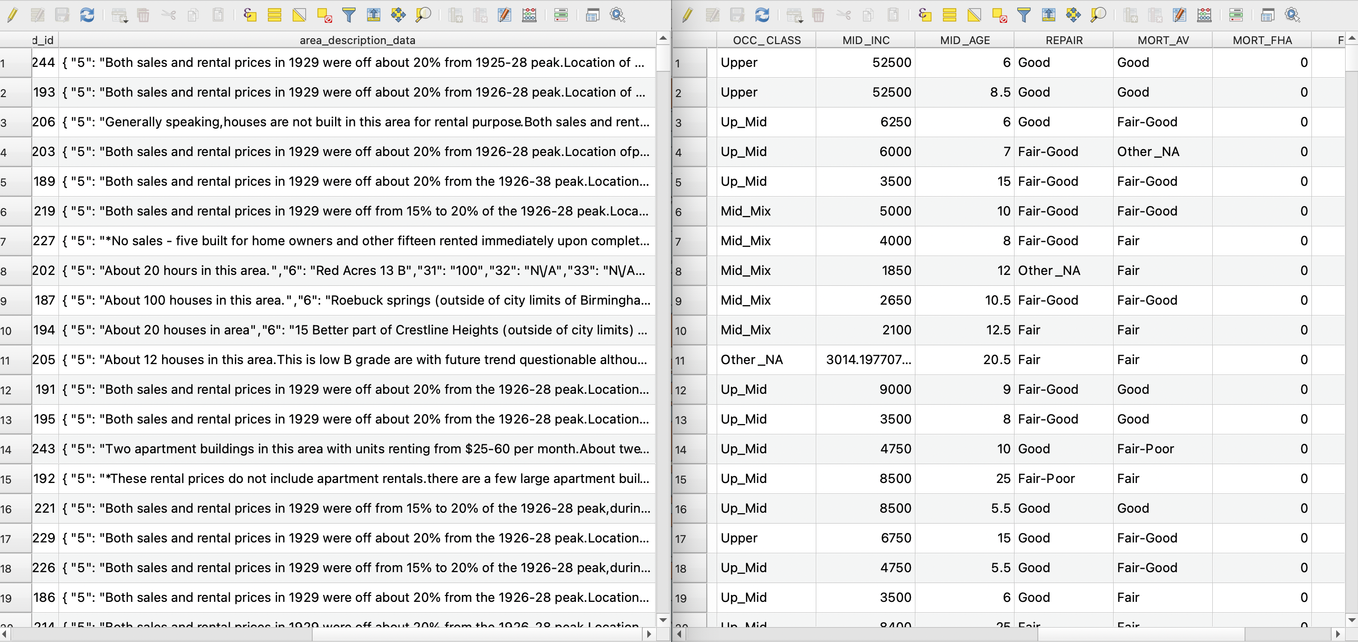 A comparison of QGIS attribute tables between DSL's one-field area description sheets (left) and Scott's tabulated dataset (right).