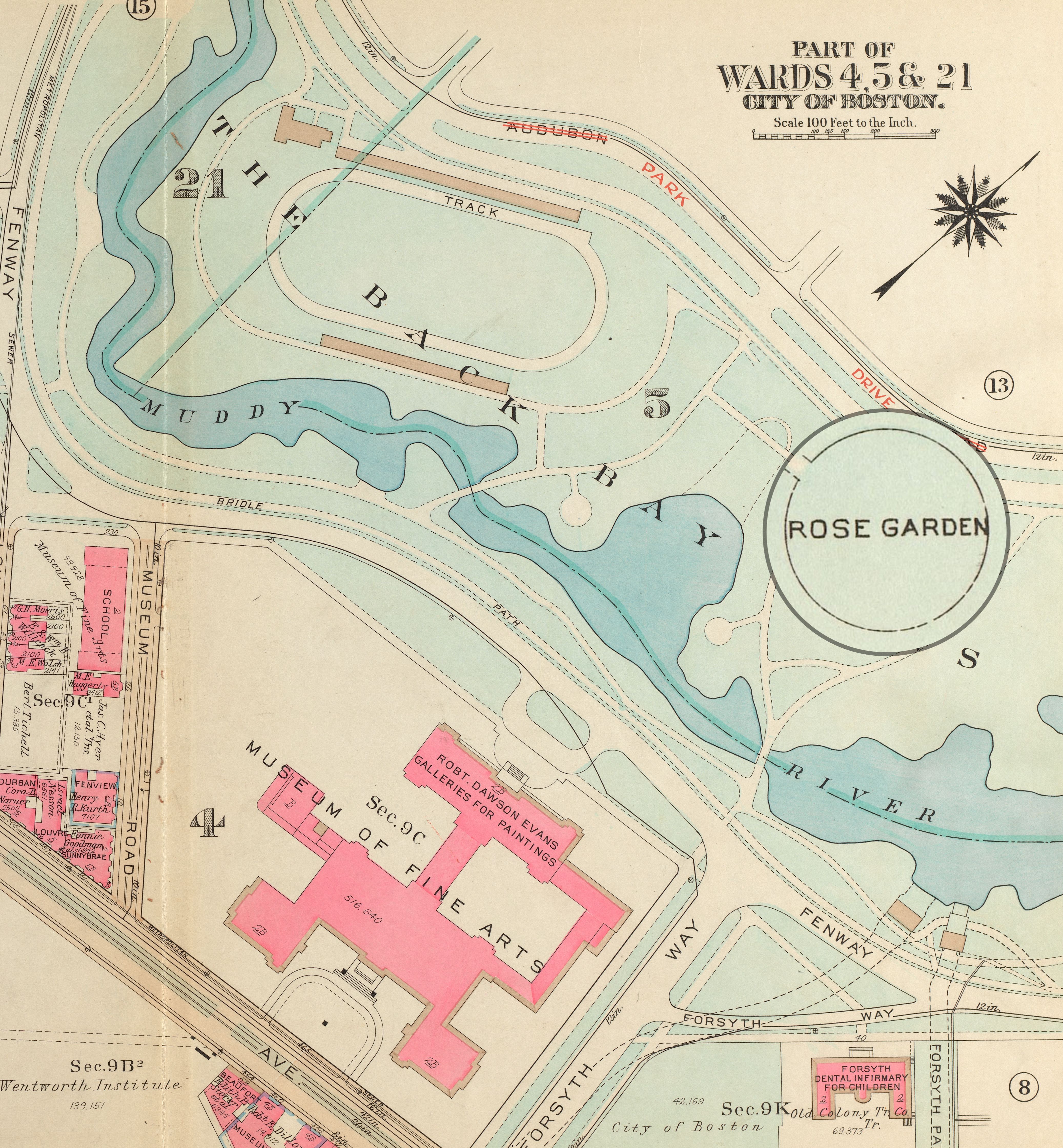 The Rose Garden is labelled on this 1931 atlas of the Back Bay Fens.
