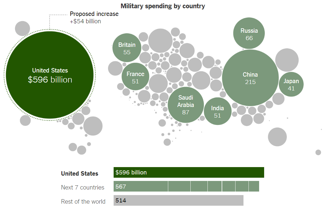 There is much to notice and wonder about the amount of military spending and the amount of military spending per capita. Examine broad regions of the world that have the most spending. What surprises you from this bubble map? Notice and wonder about the nine additional graphs from the article.