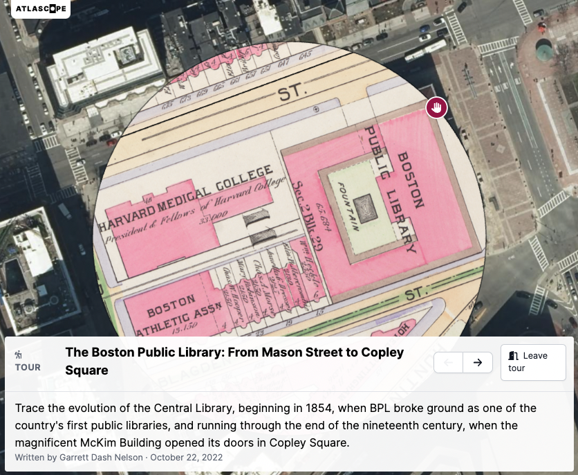 Earlier this year, we released an upgraded version of Atlascope with new features to empower storytelling, annotation, and discovery, as well as connections into other Massachusetts digital collections. One of these new features is a tour feature, which allows individual Atlascope users to narrate their own historical story on a theme or topic important to them. Just like a physical walking tour, these annotated tours lead the tour-taker through specific sites in and around Boston, highlighting important buildings, streets, or relevant facts, and illuminating historical tidbits among the atlas layers.