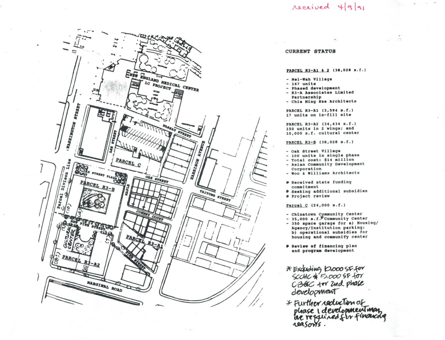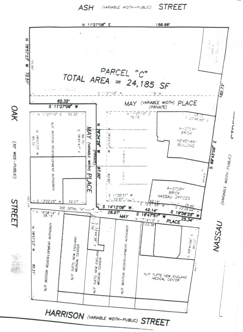 Parcel C is a 25,000 square foot parcel of land which was cleared by the BRA in the 1960s as part of an urban renewal project and was then left empty for several decades. In the mid 1980s, T-NEMC attempted to purchase Parcel C from the BRA in order to create a multi-story parking garage. The first proposal to build an 850-car garage was rejected by the BRA. In 1990, a proposal to use the entire parcel for residential and community purposes was created and agreed upon by both T-NEMC and the Chinatown community. The BRA accepted the proposal and zoned the area accordingly. Just a few years later, T-NEMC offered the BRA $2 million in order to use most of the space for a parking garage and either build a community center with the rest of the space or simply give $1.8 million to the Chinatown Neighborhood Council (CNC). The BRA accepted this new proposal, contradicting its earlier decision.