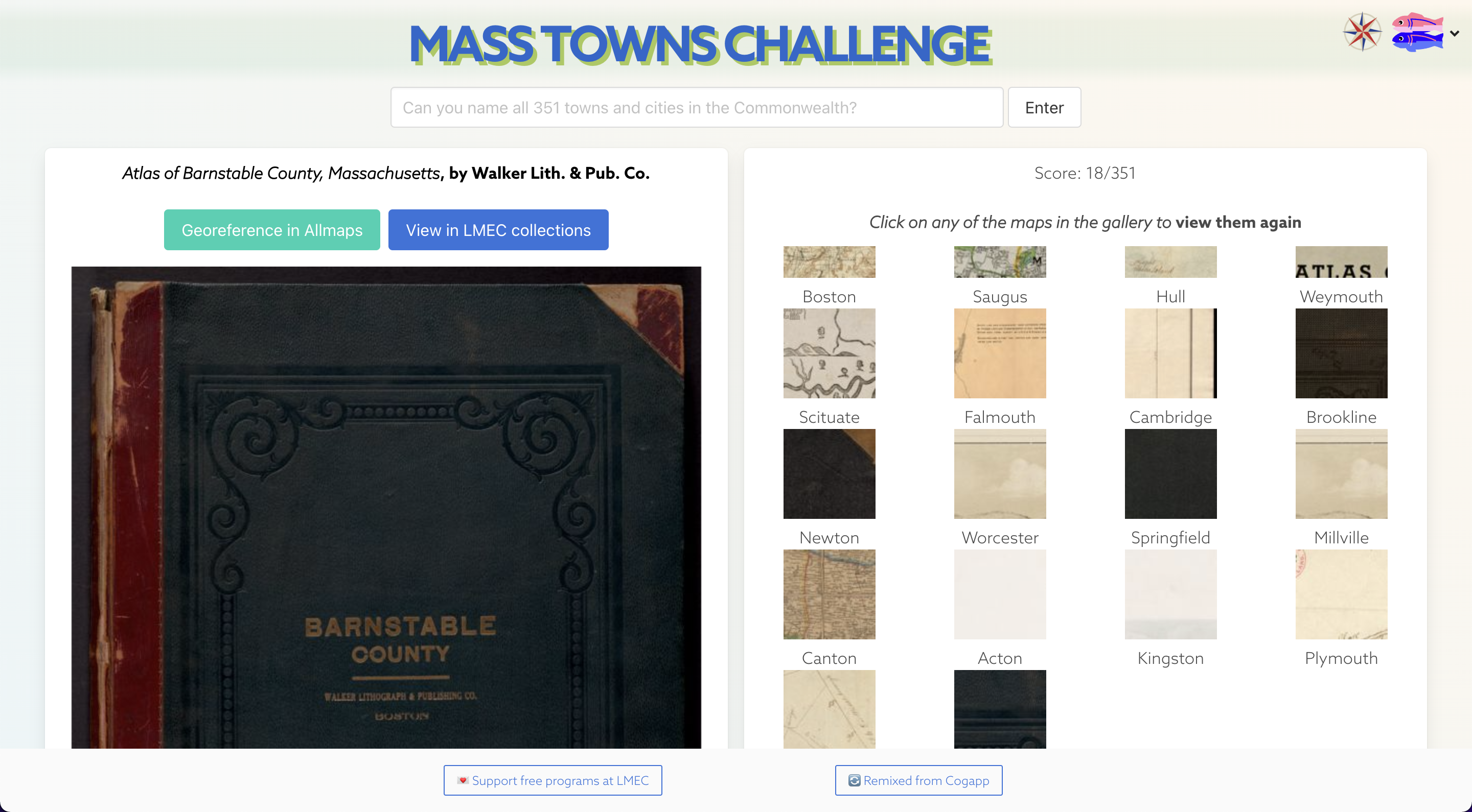 Entering the cartographic archives of the LMEC—or any other map library, for that matter—can feel a lot like a guessing game. You don't always know what you're looking for, and sometimes what you find opens up more questions than it answers. We've built lots of tools, such as @auto_mapic and Atlascope, that approach this guessing game from different angles, but every approach is partial and imperfect. Our hope in building little games like the Mass Towns Challenge is to provide unexpected insights into the LMEC map collections.