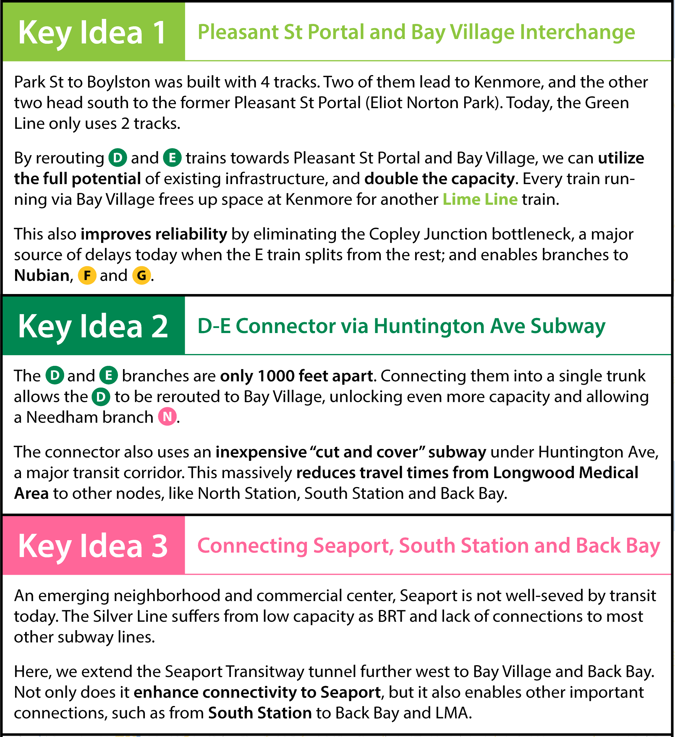 Three key ideas underpinning Charles' proposed Green Line reconfiguration.