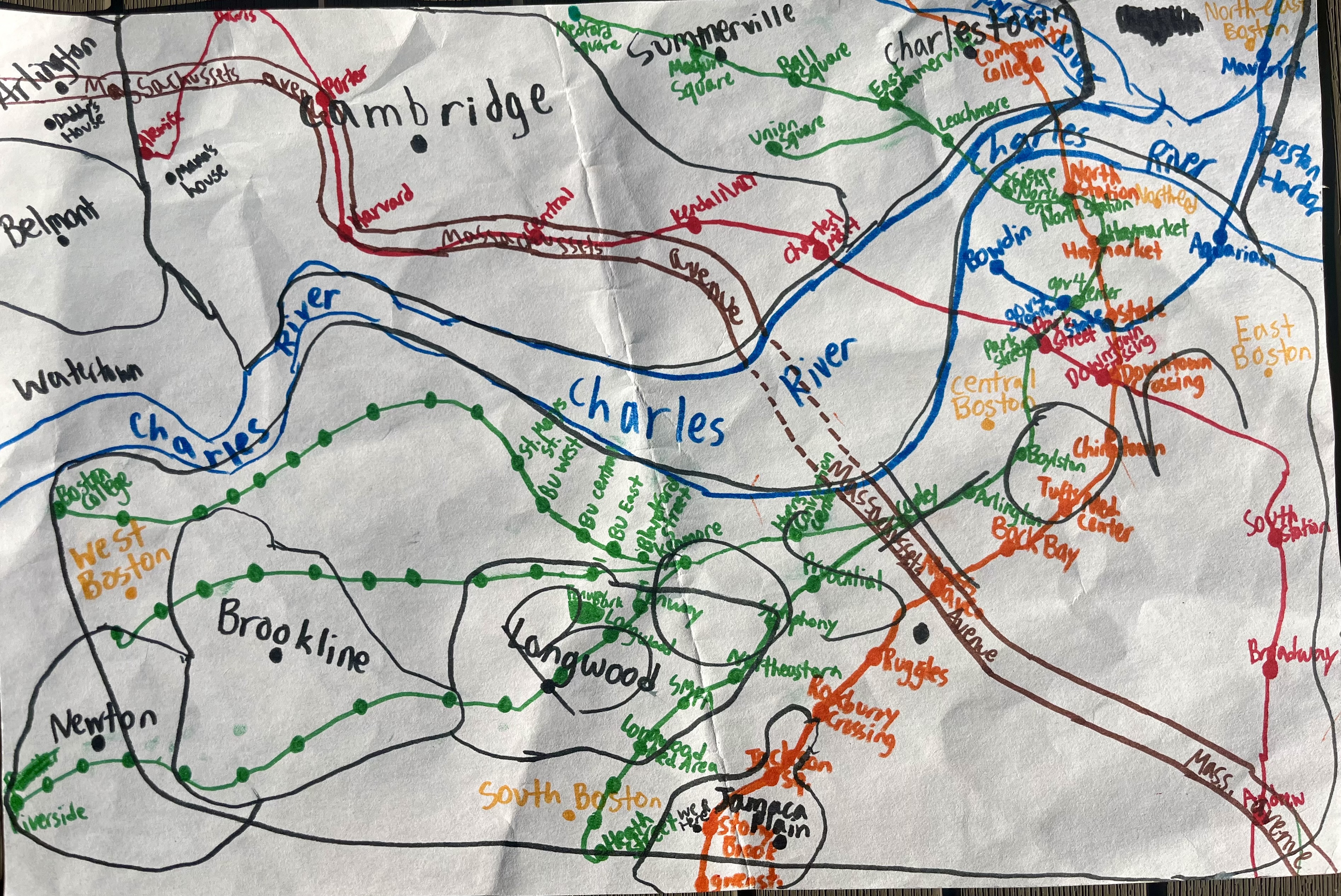 In a decisive victory, eleven-year-old Alessandro Navarro Gatti took home the people's choice award. Alessandro has been drawing maps of Boston and Cambridge every day since the age of four, a practice that he continues every day, evidenced by numerous notebooks and sketch pads full of hand drawn maps. His winning submission includes numerous features of interest, including the main thoroughfare of Massachusetts Avenue, the Charles River, city boundaries, and of course, the lines of the T. Having fallen in love with the MBTA as a toddler, Alessandro is now an avid rider of the system, and finds it soothing to draw maps of the system.