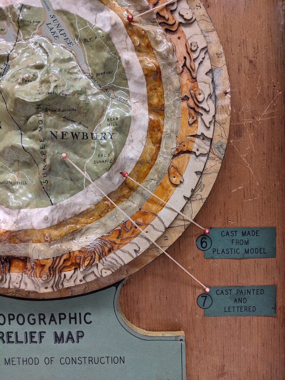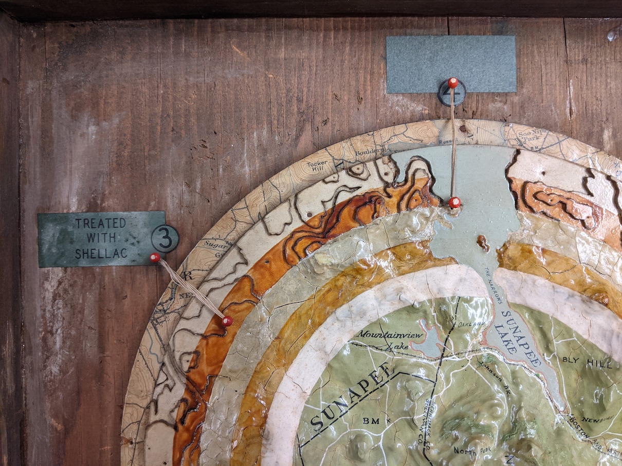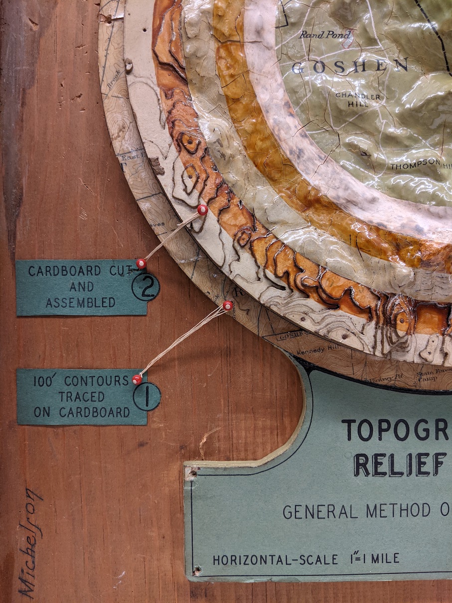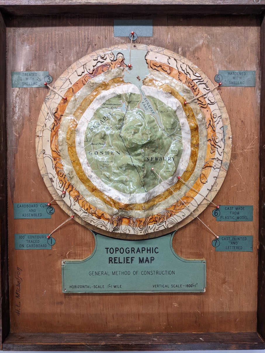 This model shows the process for making 3D raised relief maps in the early 20th century. Using a topographic map with contour lines, a model was built up in layers of cardboard, filled with plaster to smooth out the edges, and covered with shellac. Usually a mold was made from the model, and was then used to create plaster or plastic casts.