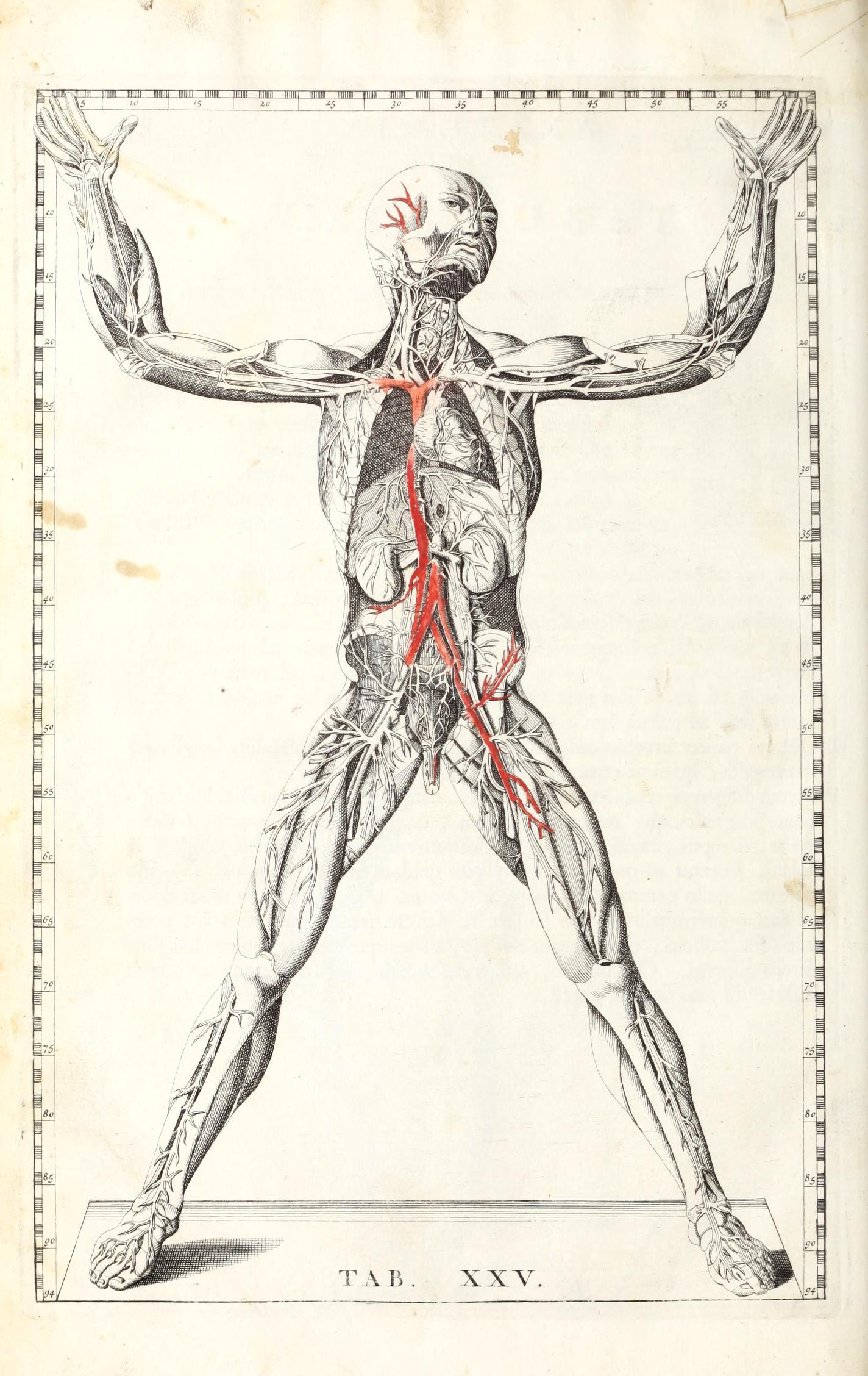 The normative measurement scale on the border of Bartholomaeus Eustachius' 'tabulae XXv,' Tabulae anatomicae classisimi (1722) is reminiscent of lines of longitude and latitude. University of Maryland, Baltimore.