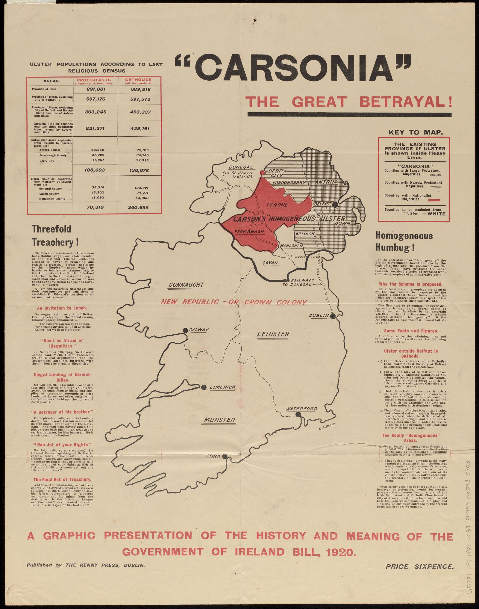 In this 1920 broadside, Irish nationalists scoffed at what they called a “homogeneous humbug”—a British proposal to partition the island into Protestant and Catholic sections. With dark red dramatizing the Catholic-majority areas that remained inside of Northern Ireland's proposed borders, and tables of statistics documenting the magnitude of the “threefold treachery,” this map registered a complaint that would echo through decades of bitter national struggles in Ireland.